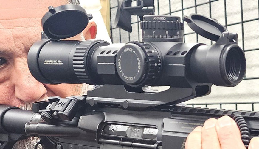 The Advance Combat Reticle Sight (ACRS) is a variable sighting system for close combat and targets up to 800 meters. The ACRS is a front focal plane illuminated reticle with combined range finding and bullet drop compensation (BDC). The 1.5x-8x magnification is effective for low light shooting and target identification. At 1.5 magnification, the horse shoe reticle is small and will act as a red dot for CQB distances.